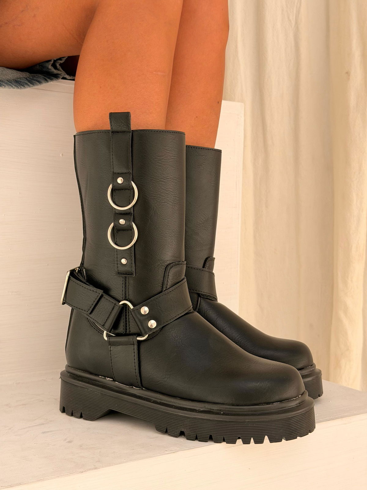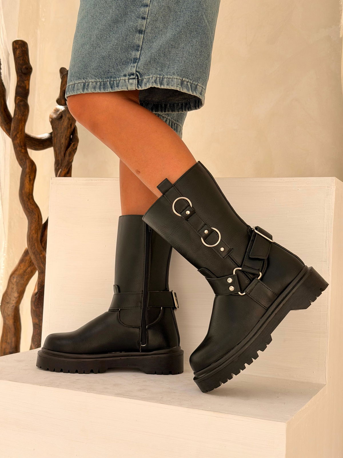 Botas caña media confeccionadas en Cuero Ecológico. Base de goma inyectada. Detalle de hebillas y precintos