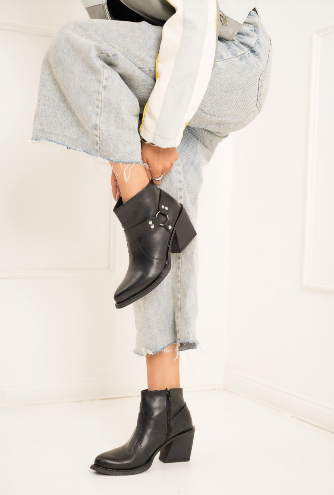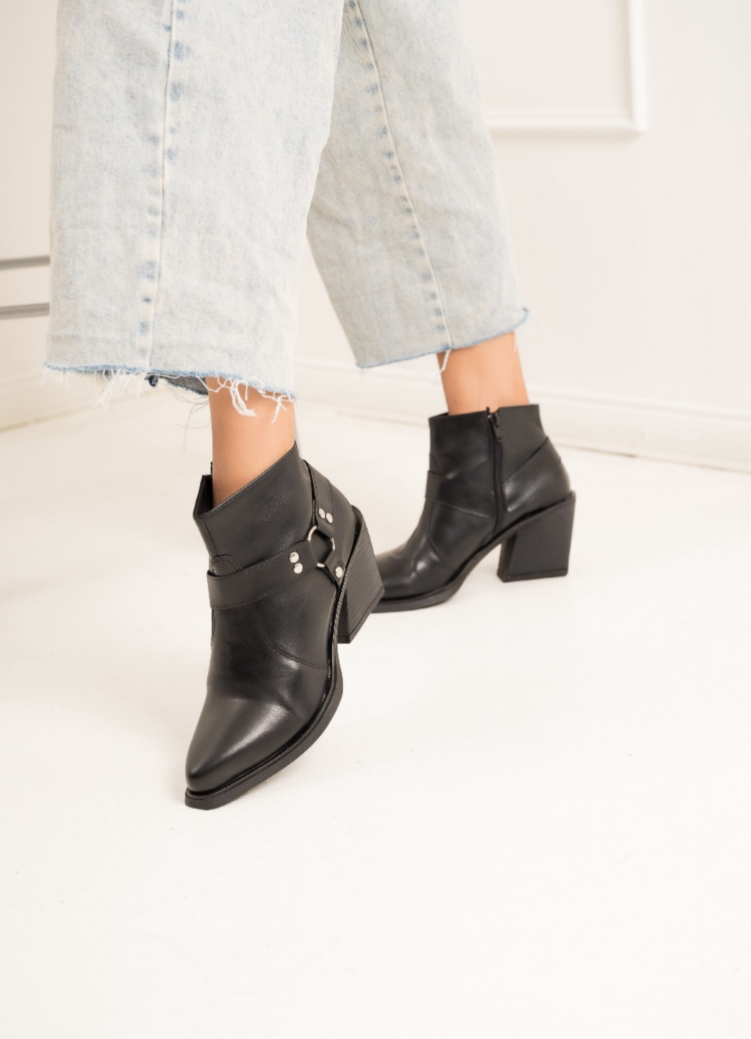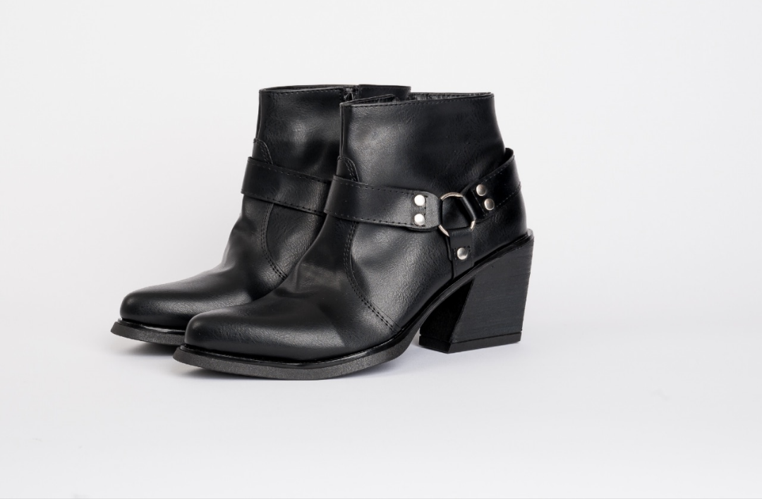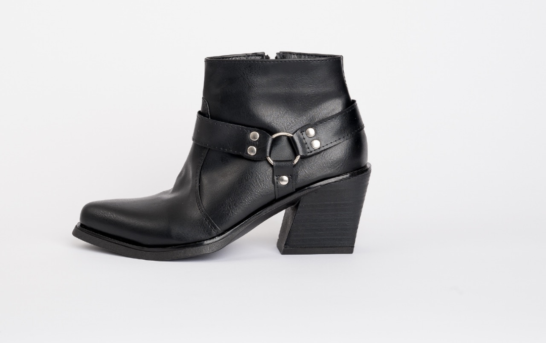 Botineta de cuero ecológico con arnés y taco medio