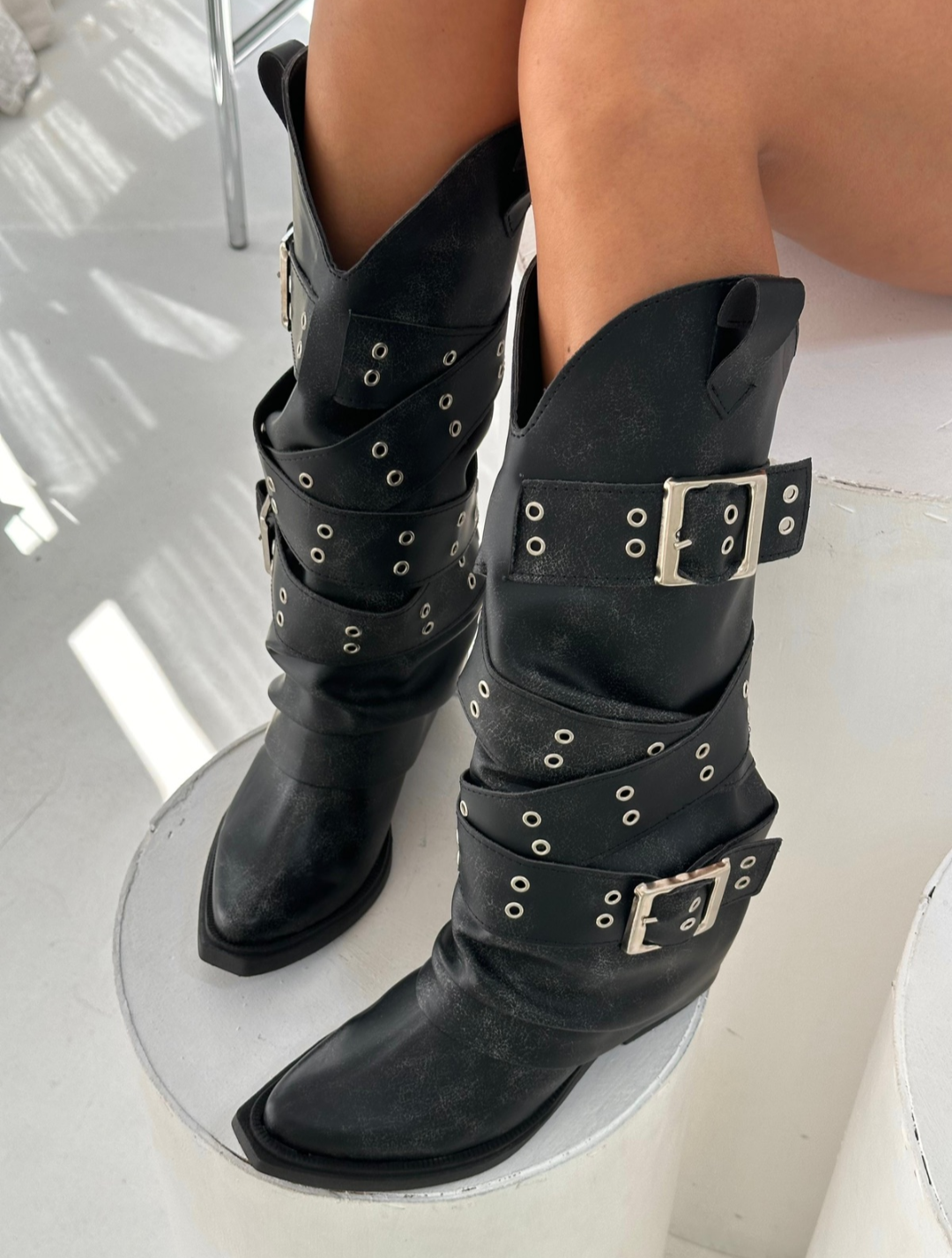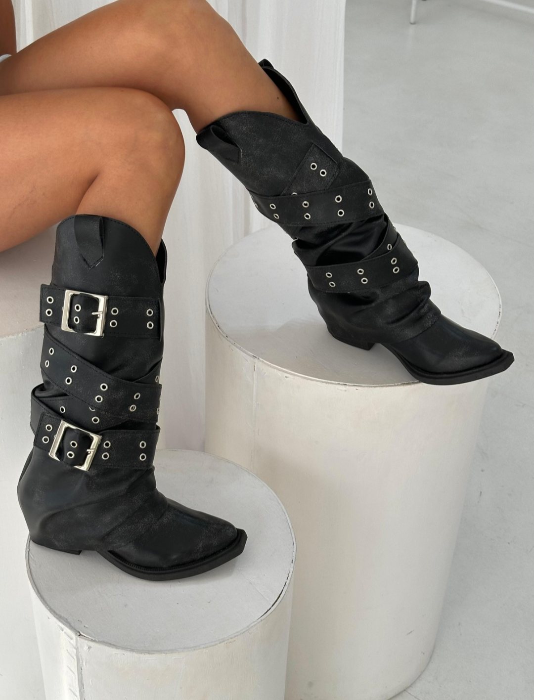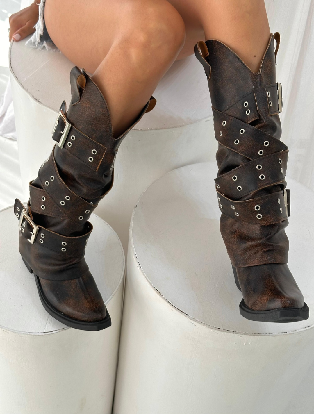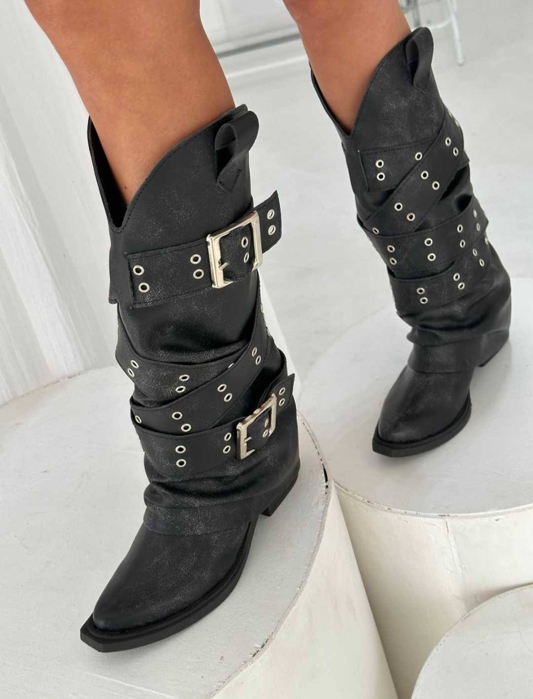 Nuestras nuevas botas combinan la esencia del estilo cowboy con la fuerza de la estética motoquera. Confeccionadas en cuero sintético de alta calidad con efecto gastado, este modelo destaca por sus múltiples hebillas plateadas y tachas que envuelven la caña.