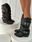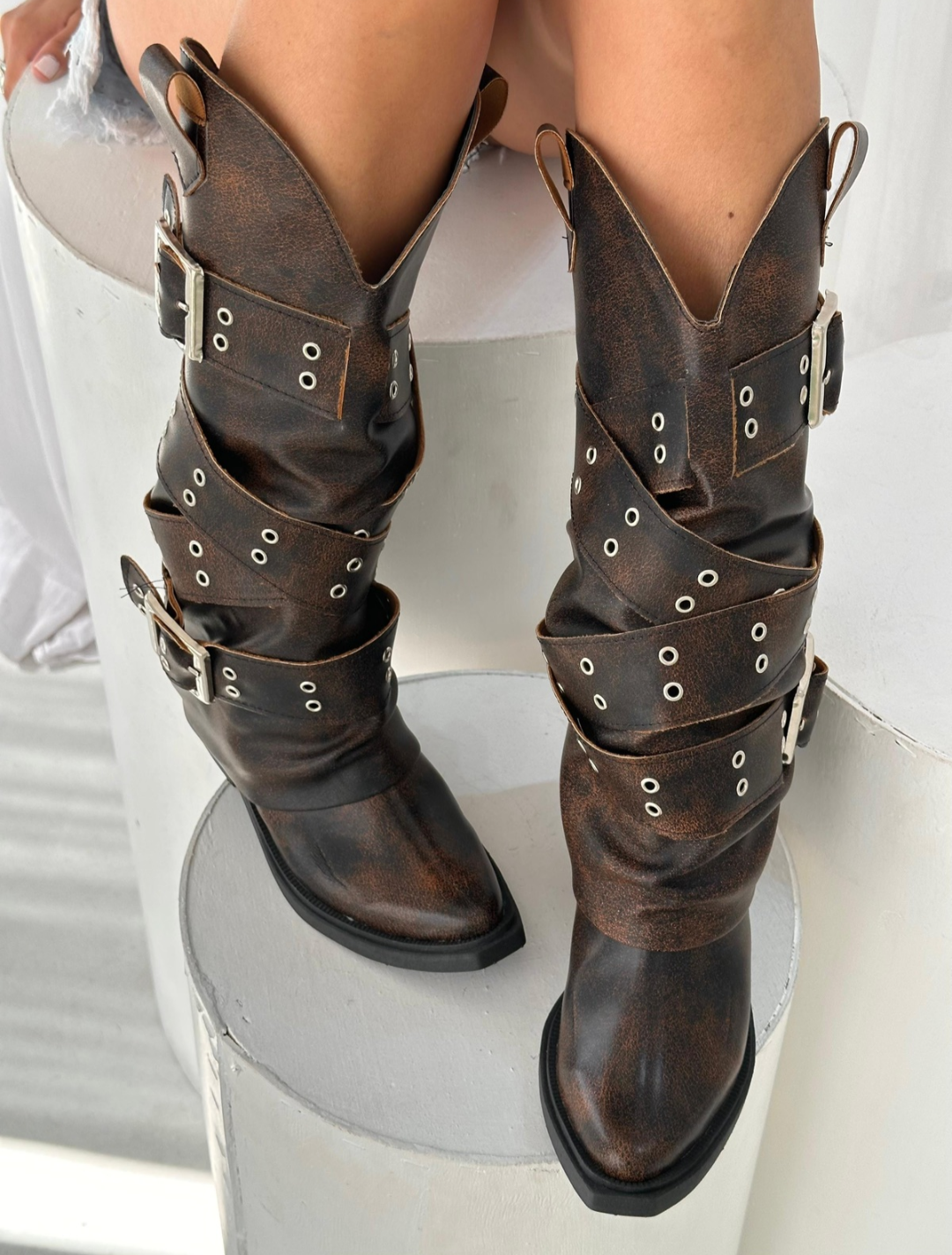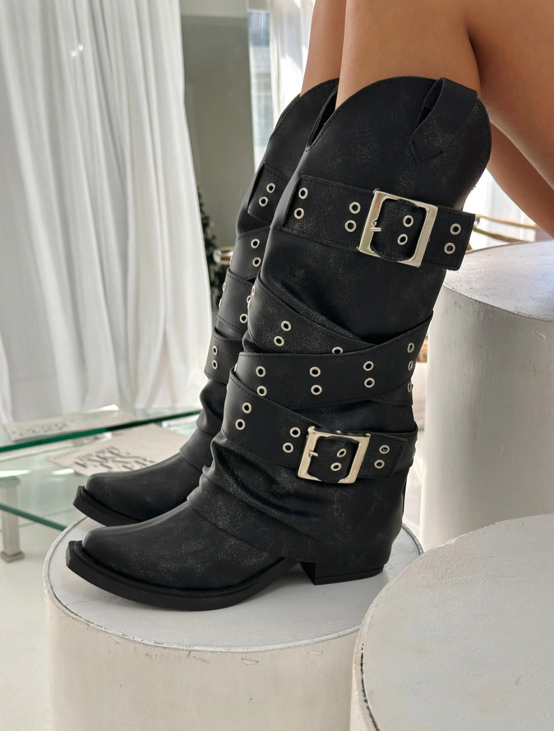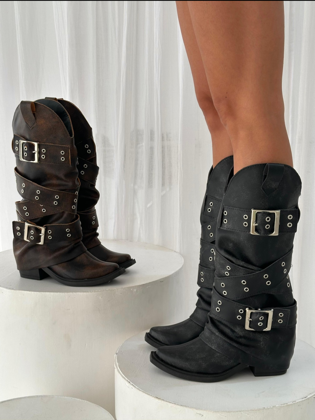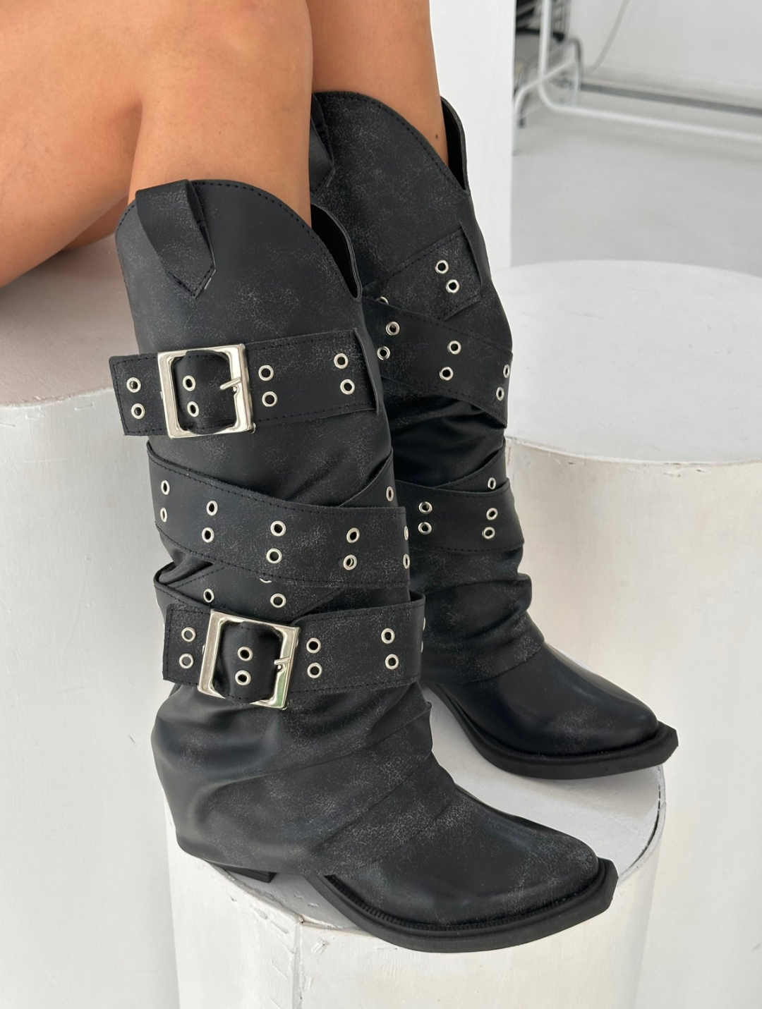 Nuestras nuevas botas combinan la esencia del estilo cowboy con la fuerza de la estética motoquera. Confeccionadas en cuero sintético de alta calidad con efecto gastado, este modelo destaca por sus múltiples hebillas plateadas y tachas que envuelven la caña.