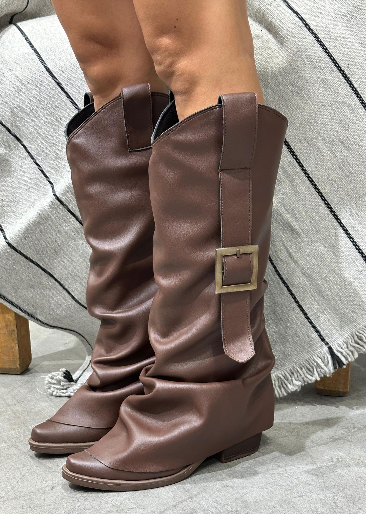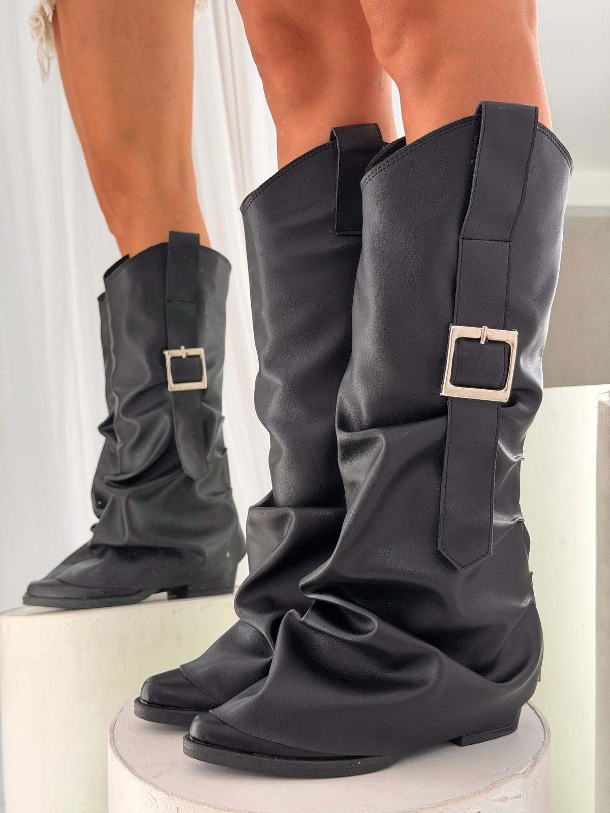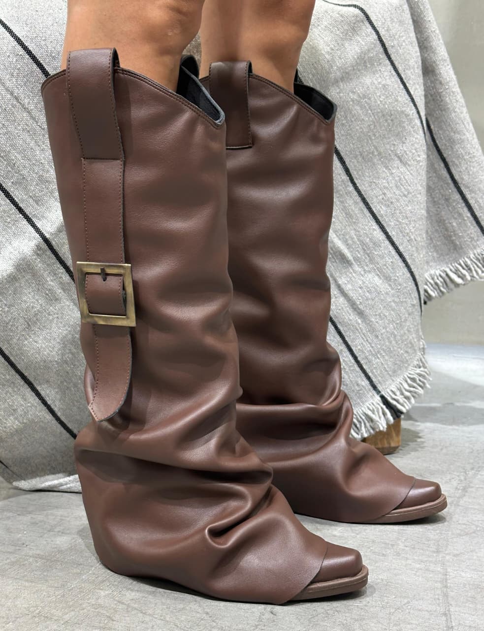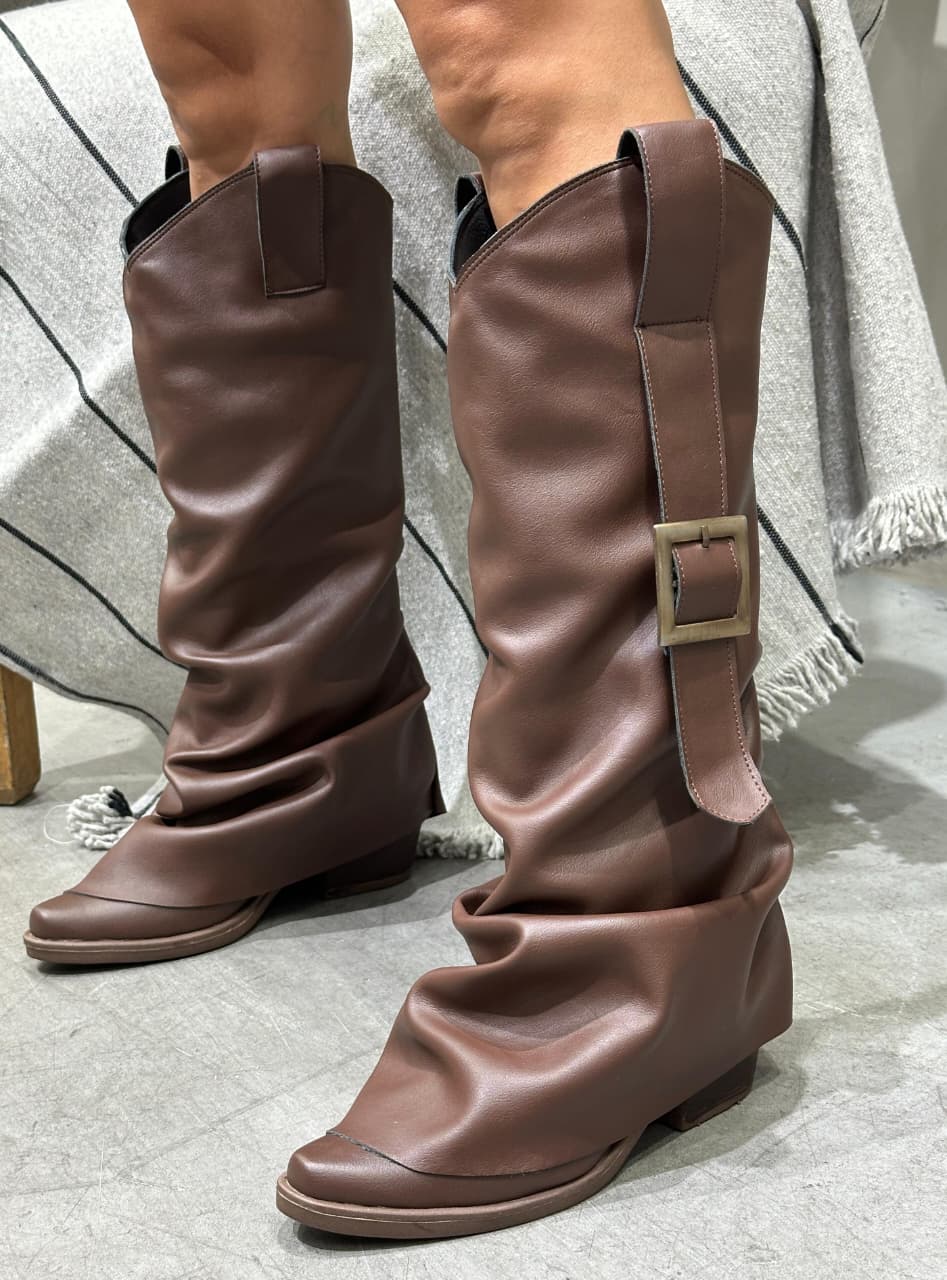 El efecto slouchy cae de forma natural y estiliza la pierna. El diseño se completa con una hebilla lateral metálica, que suma carácter y un toque sofisticado.