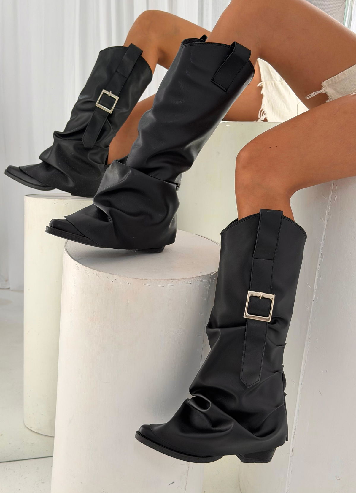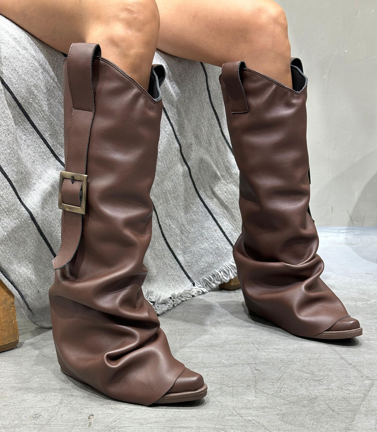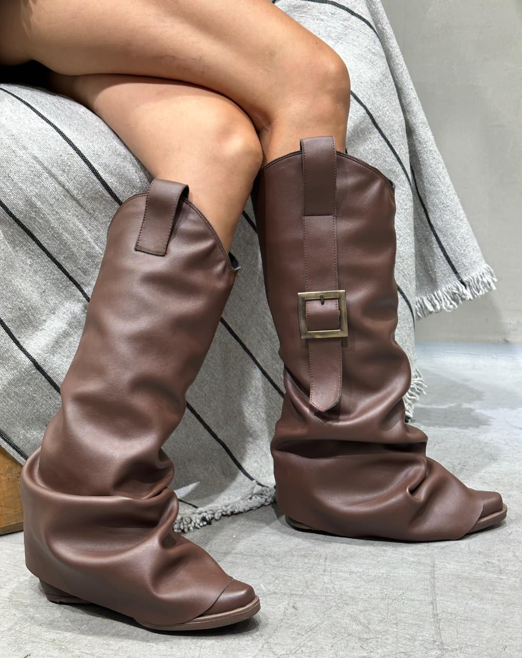 El efecto slouchy cae de forma natural y estiliza la pierna. El diseño se completa con una hebilla lateral metálica, que suma carácter y un toque sofisticado.